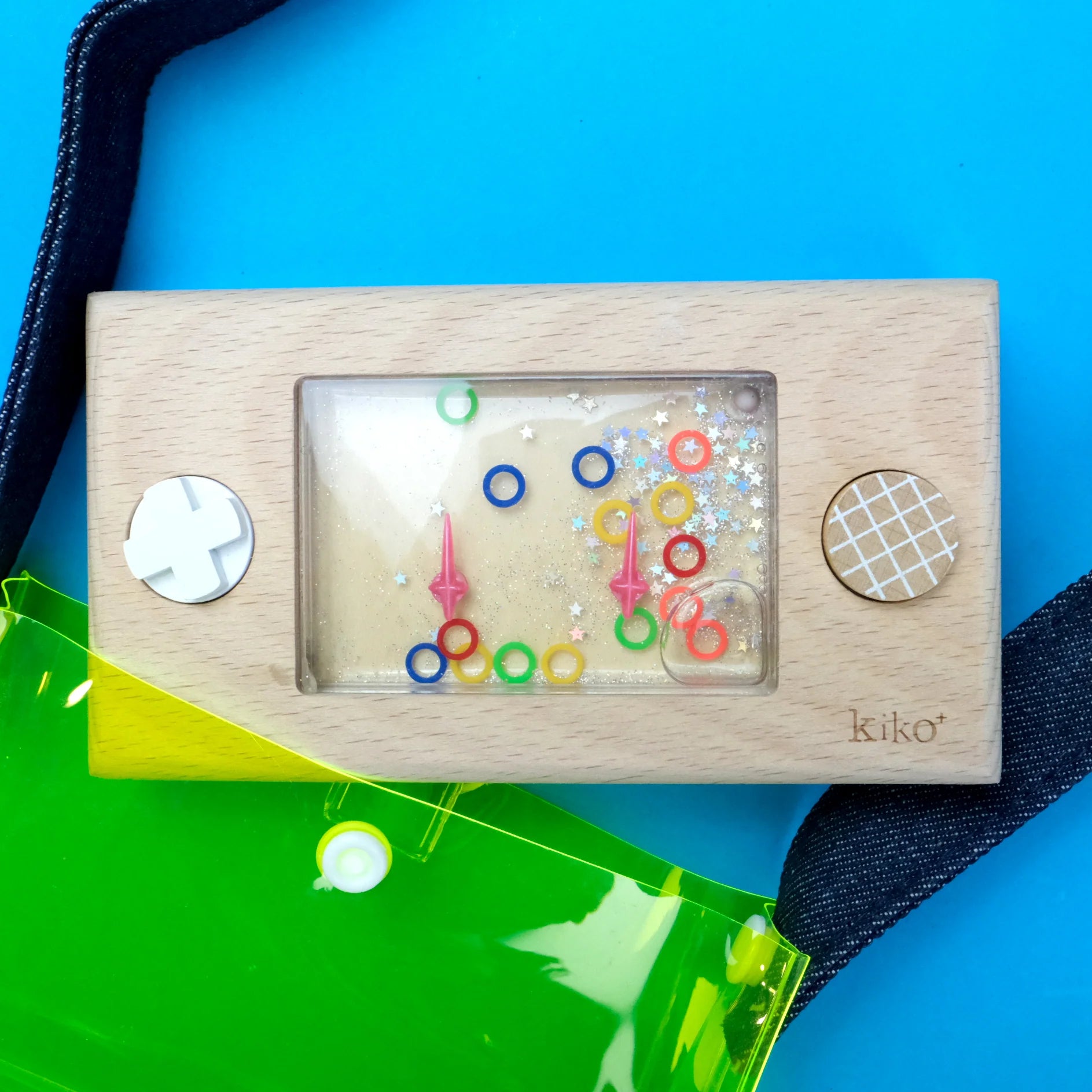 Fill it with water, slot in the rainbow hoops, and use your thumbs on the two buttons to launch each hoop onto the tiny spikes. Sounds easy? Spoiler: it’s not. This little game demands patience, perseverance, and just the right mix of luck and skill. You’ll be hooked in seconds, chasing that oh-so-satisfying final ring.