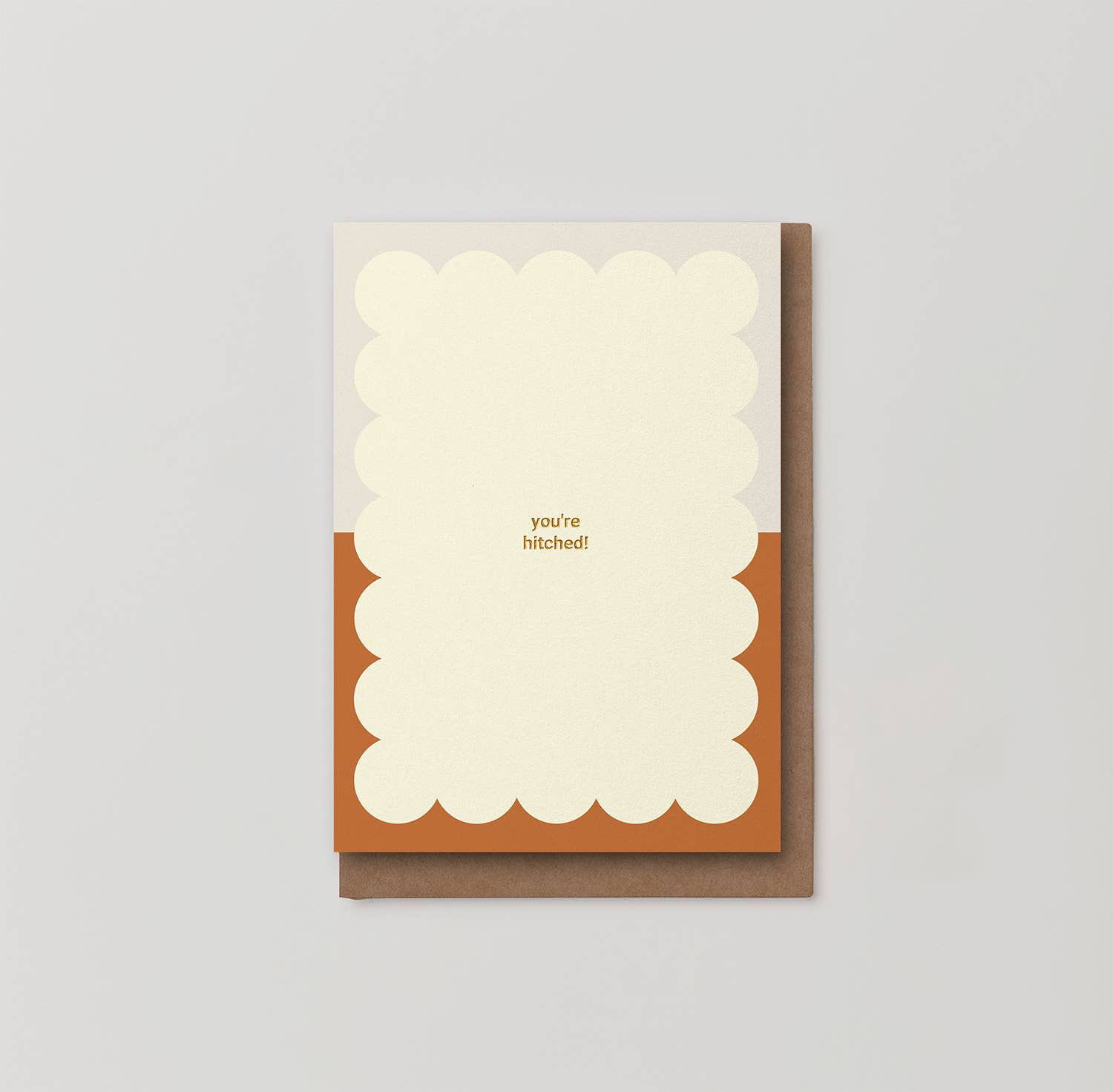 A quietly modern wedding card from Kinshipped, designed with a soft palette of cream, gentle grey and warm salmon tones. The front features a scalloped, cloud-like graphic that frames the message in a simple, balanced composition, finished with gold foil lettering that reads “you’re hitched”.