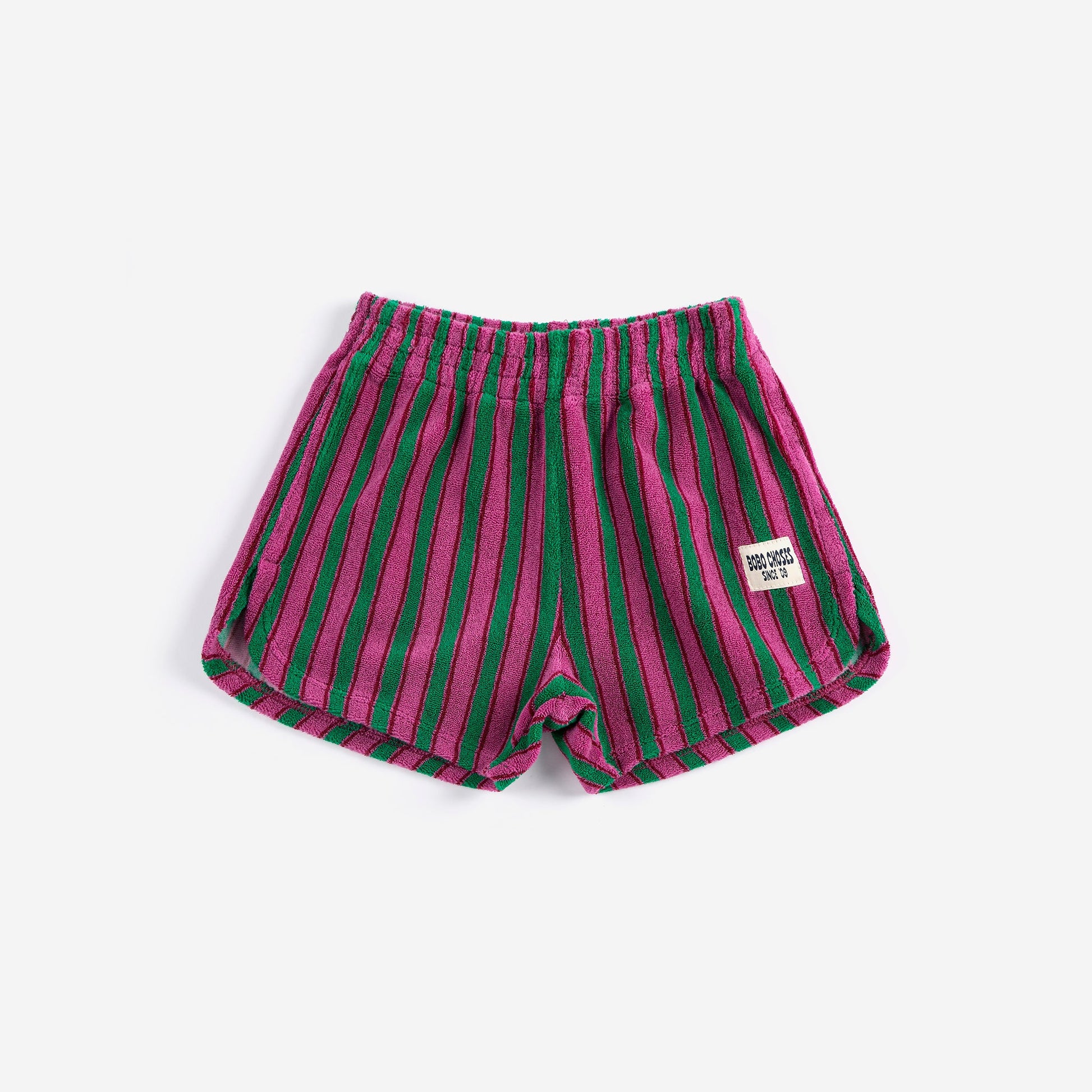 These striped terry cloth shorts are part of Bobo Choses’ SS26 Pickles story — a season shaped by long days, small discoveries and doing things in whatever order feels right. The vertical berry and green stripes are bold and instinctive, the kind of colours kids gravitate towards immediately, without needing permission or explanation.