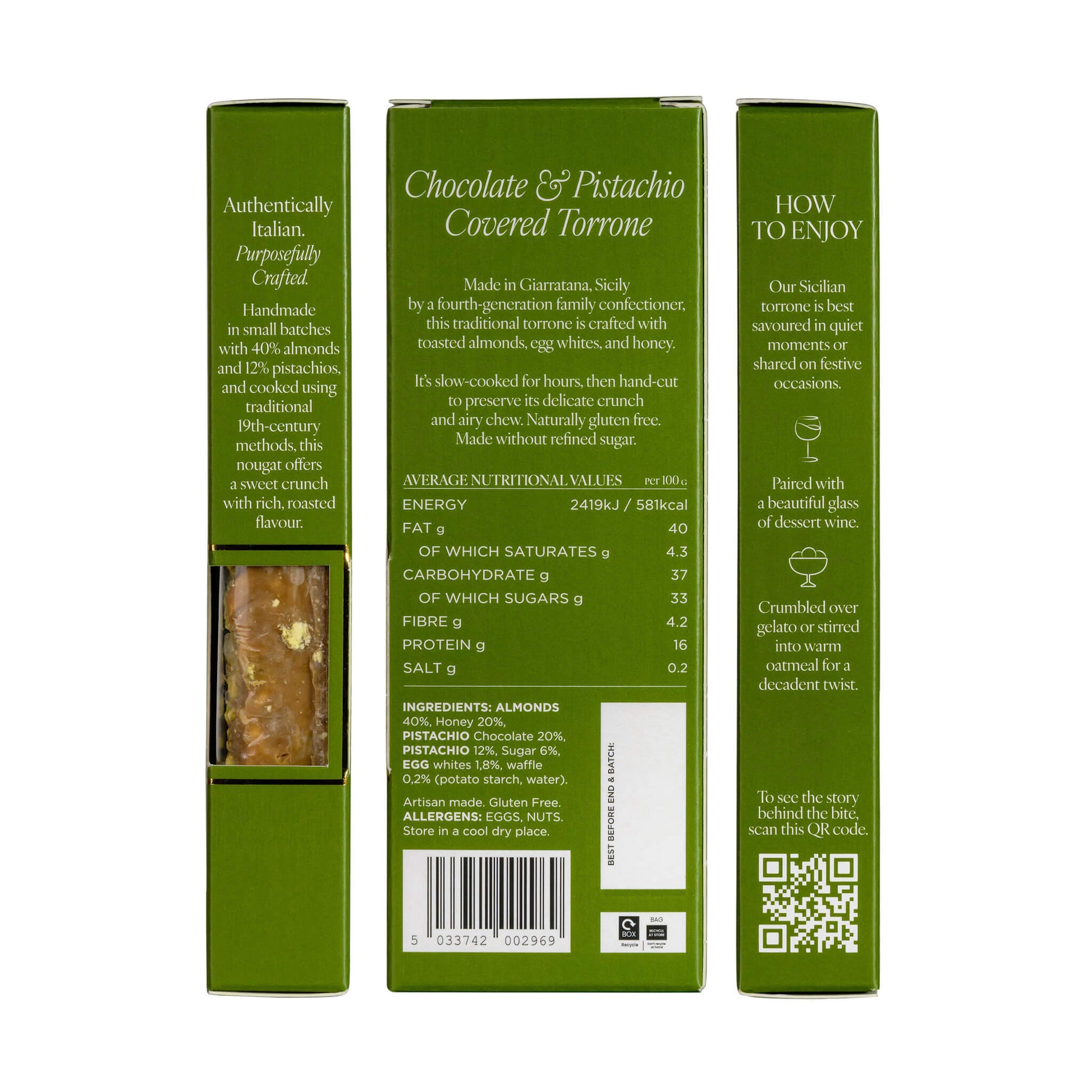 Nutty, soft and generously coated, this Pistachio & Chocolate Covered Torrone layers flavour the slow Sicilian way.