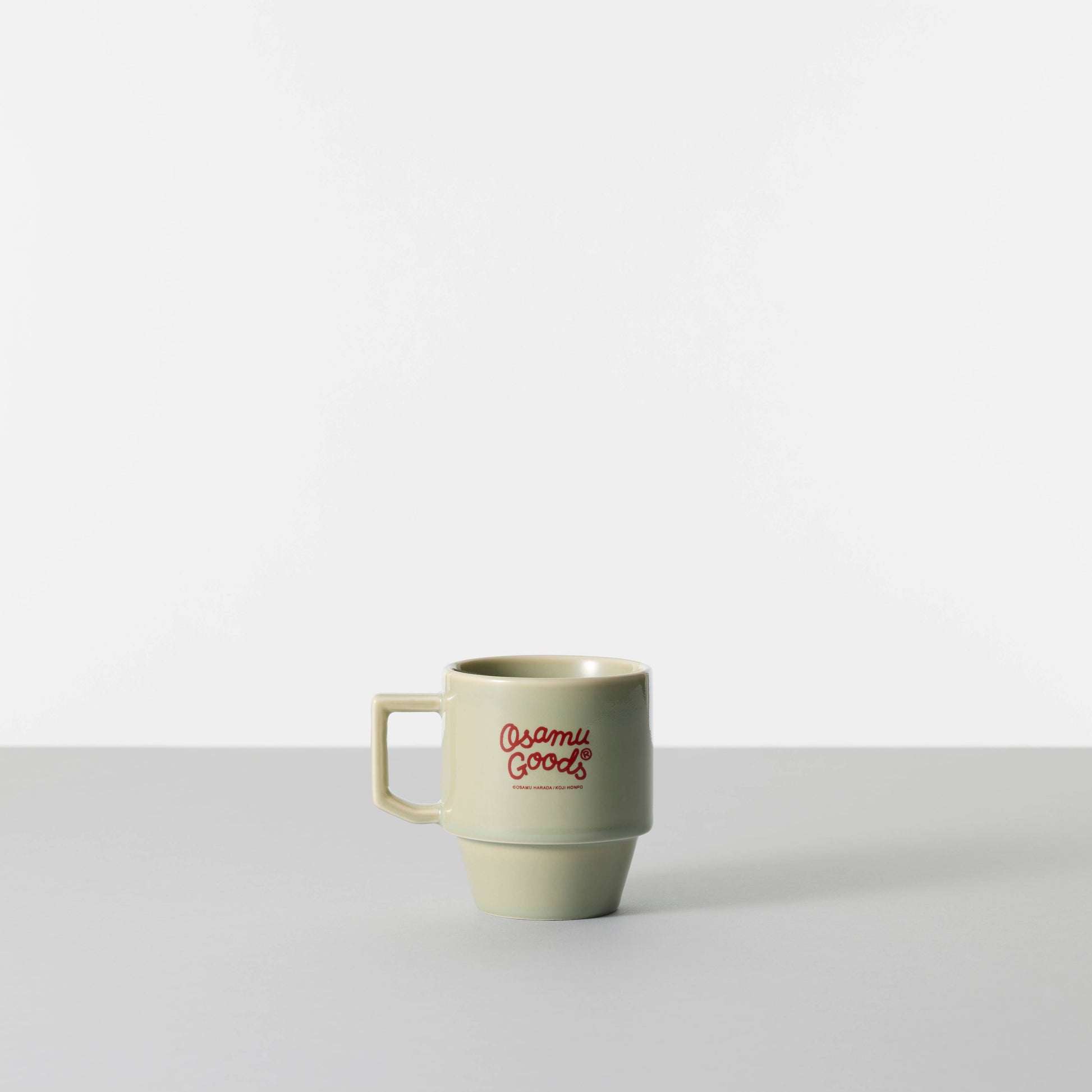 The sage glaze is the quietest colourway in the range, which suits Humpty's particular brand of composure. Squat stackable shape, angular handle, holds 300cc, microwave safe, OSAMU logo on the back. A good desk mug for someone who appreciates a character with history.