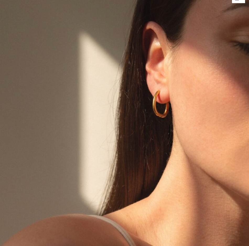 Crafted from stainless steel with a rich gold plating, the Luna Hoops are waterproof, hypoallergenic and fade-resistant, designed to hold their shine no matter how often you wear them. The smooth, sculptural finish catches the light in just the right way, while the secure click-to-lock closure keeps them comfortable from morning through to night. Minimal, sleek and refined — they’re the hoops you’ll reach for on repeat.