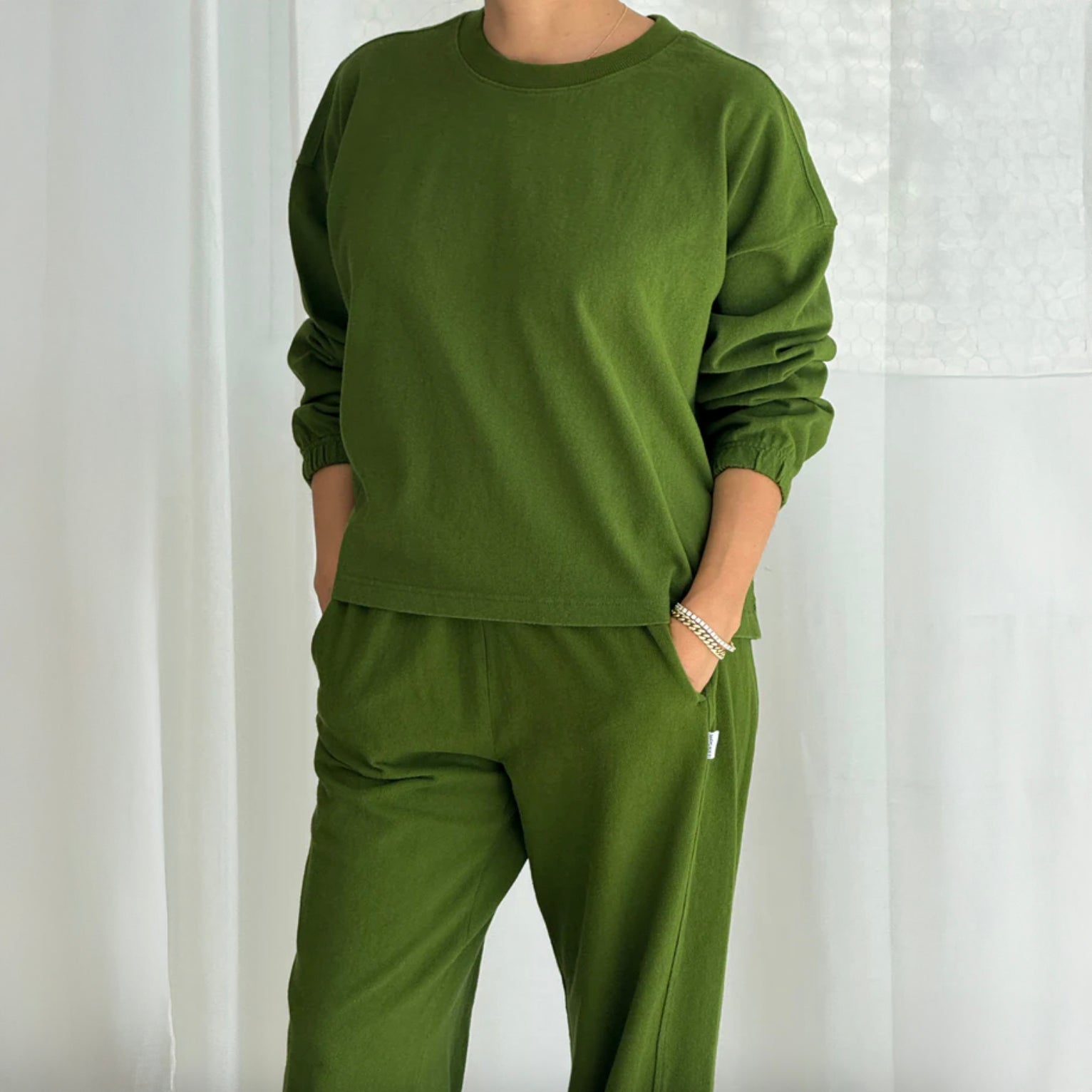 The cut is relaxed and easy: dropped shoulders, a dolman fit and elastic ruched cuffs that add just the right amount of detail. Worn down, the sleeves have a soft balloon shape; scrunched up, they give a casual edge. It’s simple, but never boring.