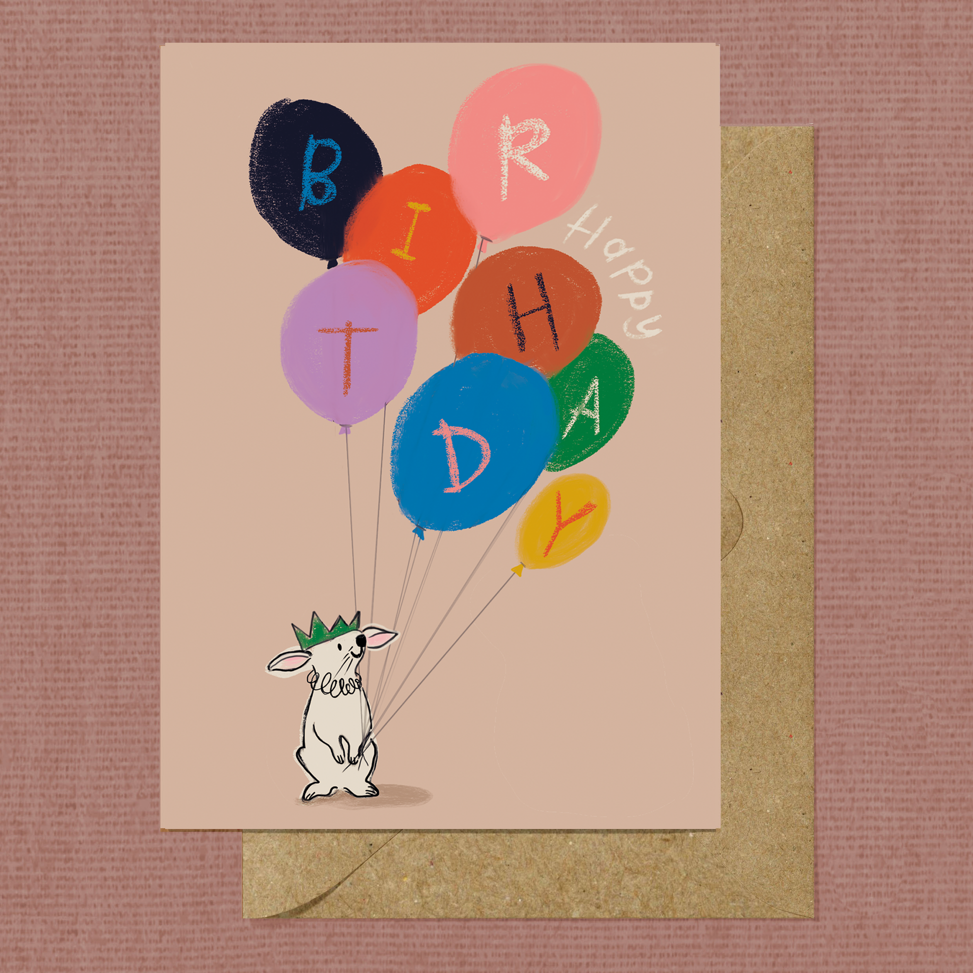 The Smudge Balloons Greeting Card is part of The Design Dealership’s Smudge range, a collection that leans into loose, painterly illustration and off-beat colour combinations. A small character stands anchored at the bottom of the composition, holding a cluster of hand-drawn balloons that spell out “Birthday” in soft, chalky lettering.