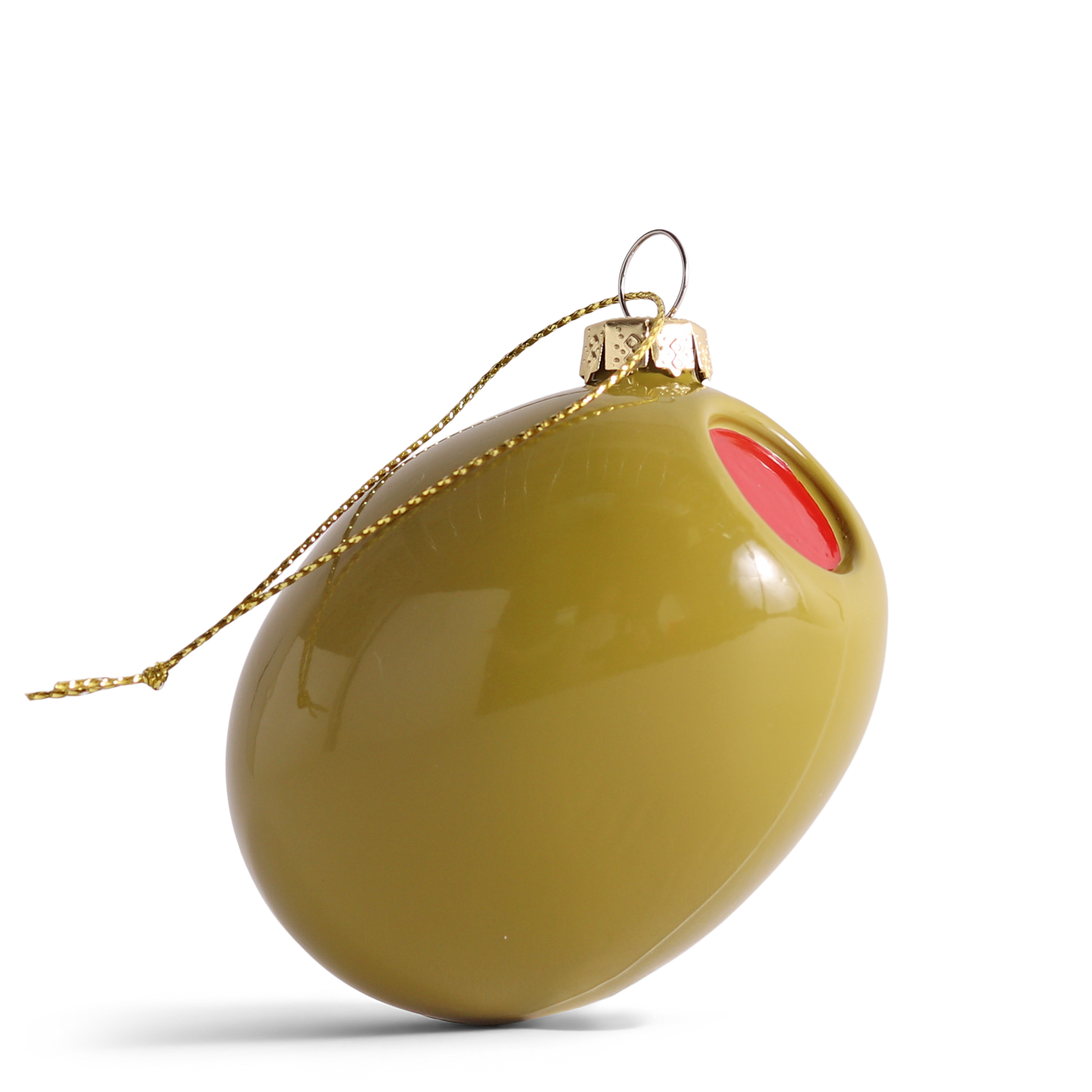 Bold, briny, and impossible to miss. Studio THIE’s Olive Glass Decoration is a cheeky nod to cocktail hour, blown up to festive proportions. Mouthblown and hand-painted by skilled artisans, it captures the glossy green sheen and signature red pimento of the real thing—only this time it’s destined for the Christmas tree, not your martini glass.
