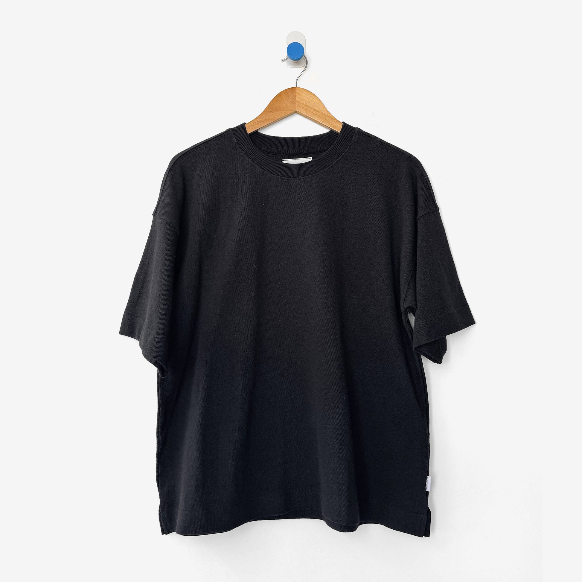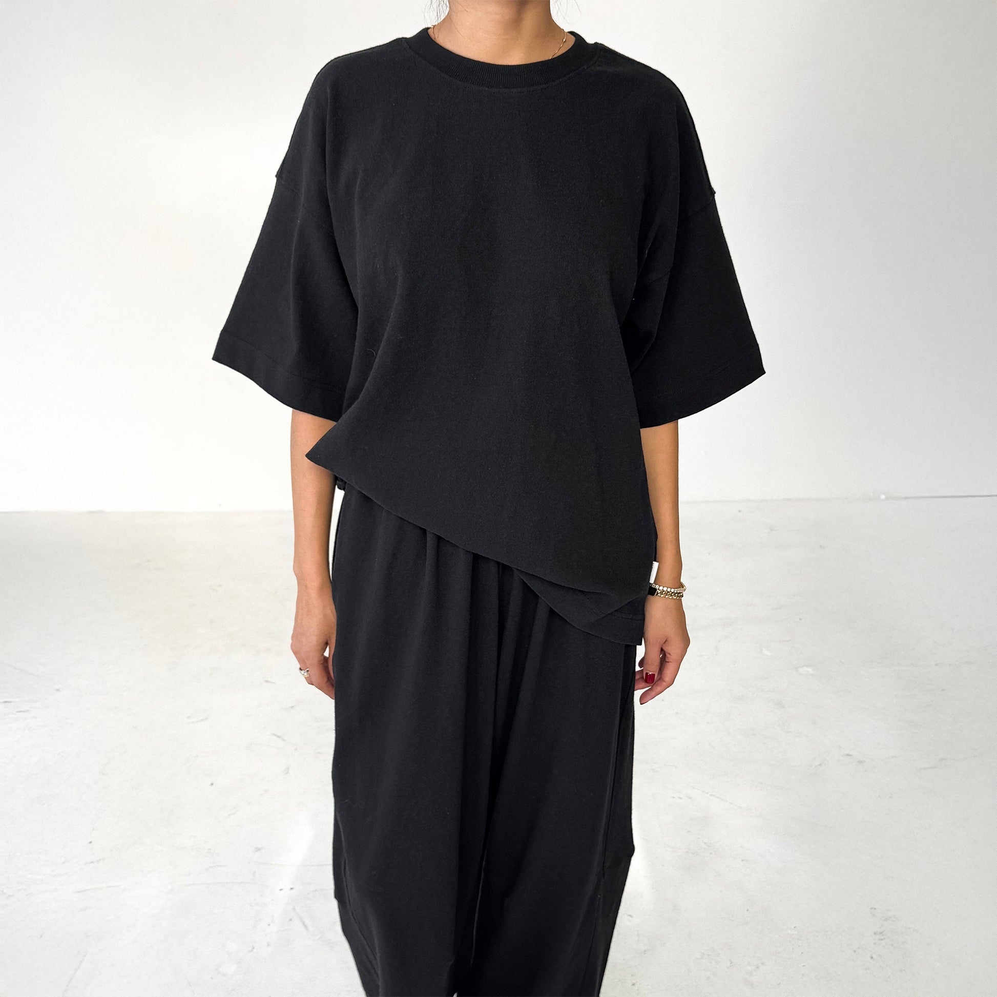 Roomy but controlled. Strong but simple. Just a well-cut black tee that does exactly what you want it to.