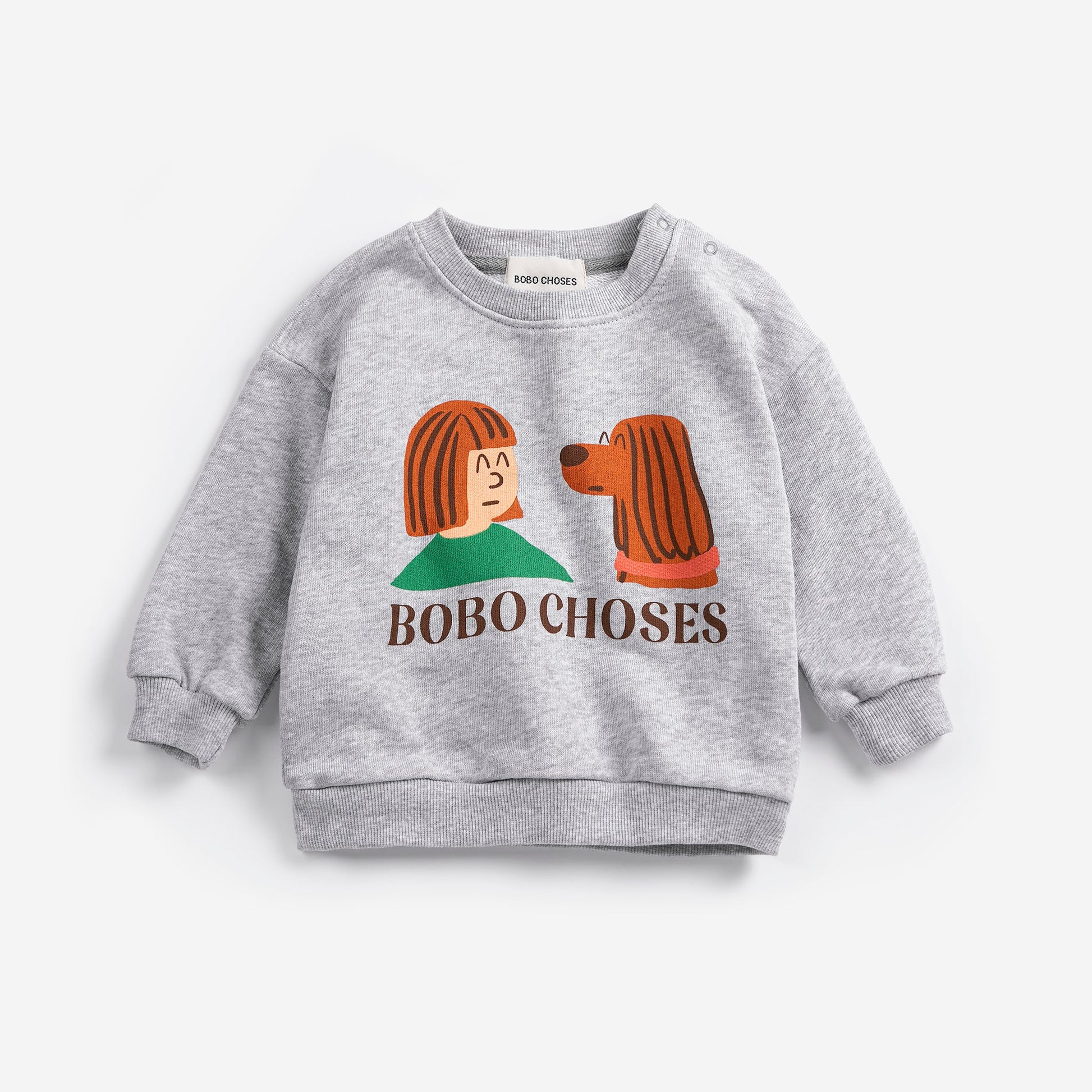 The Bobo Choses Baby Friends In A Pickle Sweatshirt is one of those pieces that quietly steals the show. Soft grey marl, a relaxed, easy shape, and that instantly recognisable illustration front and centre — a small human and a loyal dog, mid-conversation, mid-moment, mid-mischief. It’s playful without shouting, charming without trying too hard.