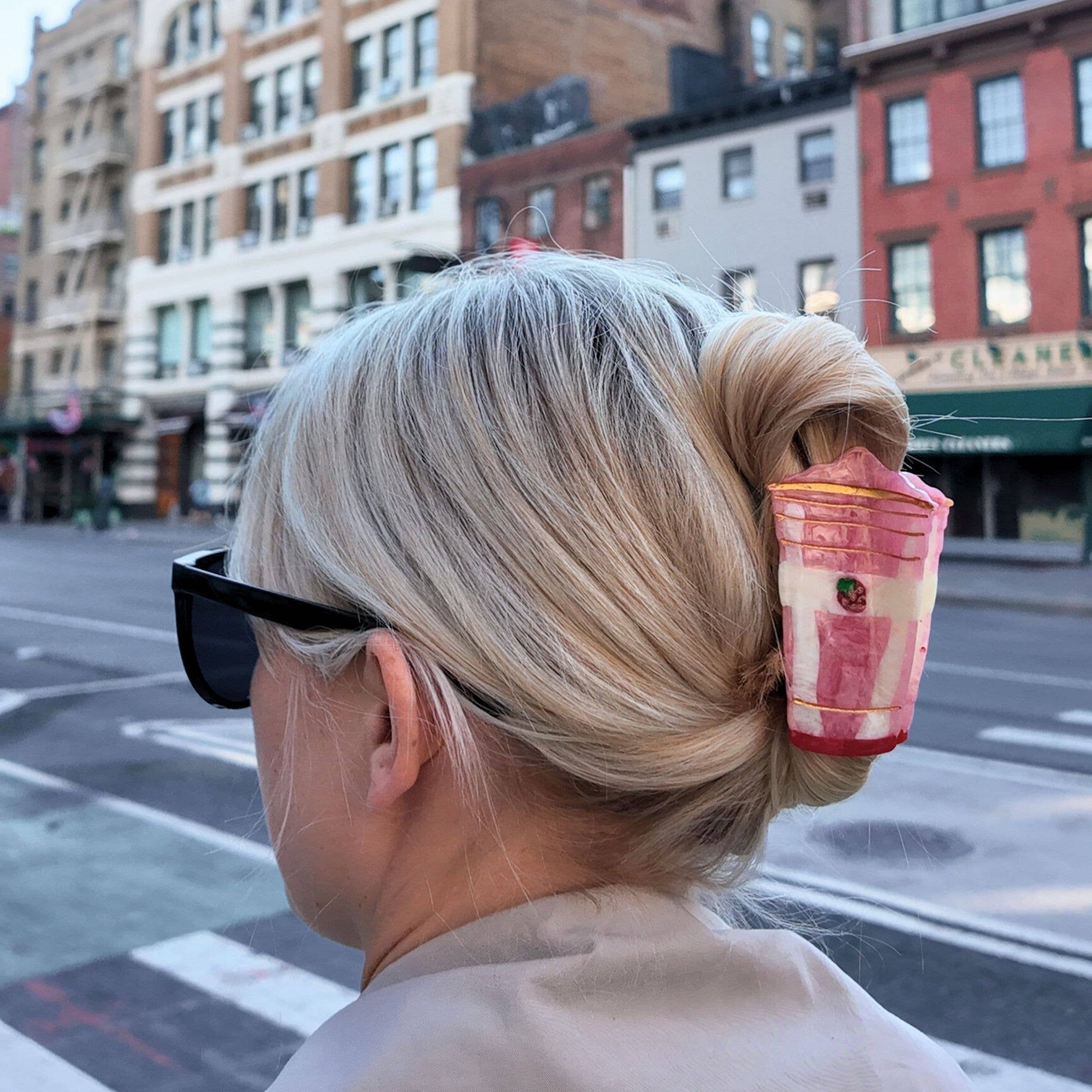 Each clip is a mini work of art – layered swirls of strawberry pink and creamy white, topped with hand-painted golden details and a tiny berry charm. Because every piece is hand-finished, no two smoothies are ever the same. It’s playful, nostalgic, and guaranteed to make your everyday bun or clawed-back style way more fun.