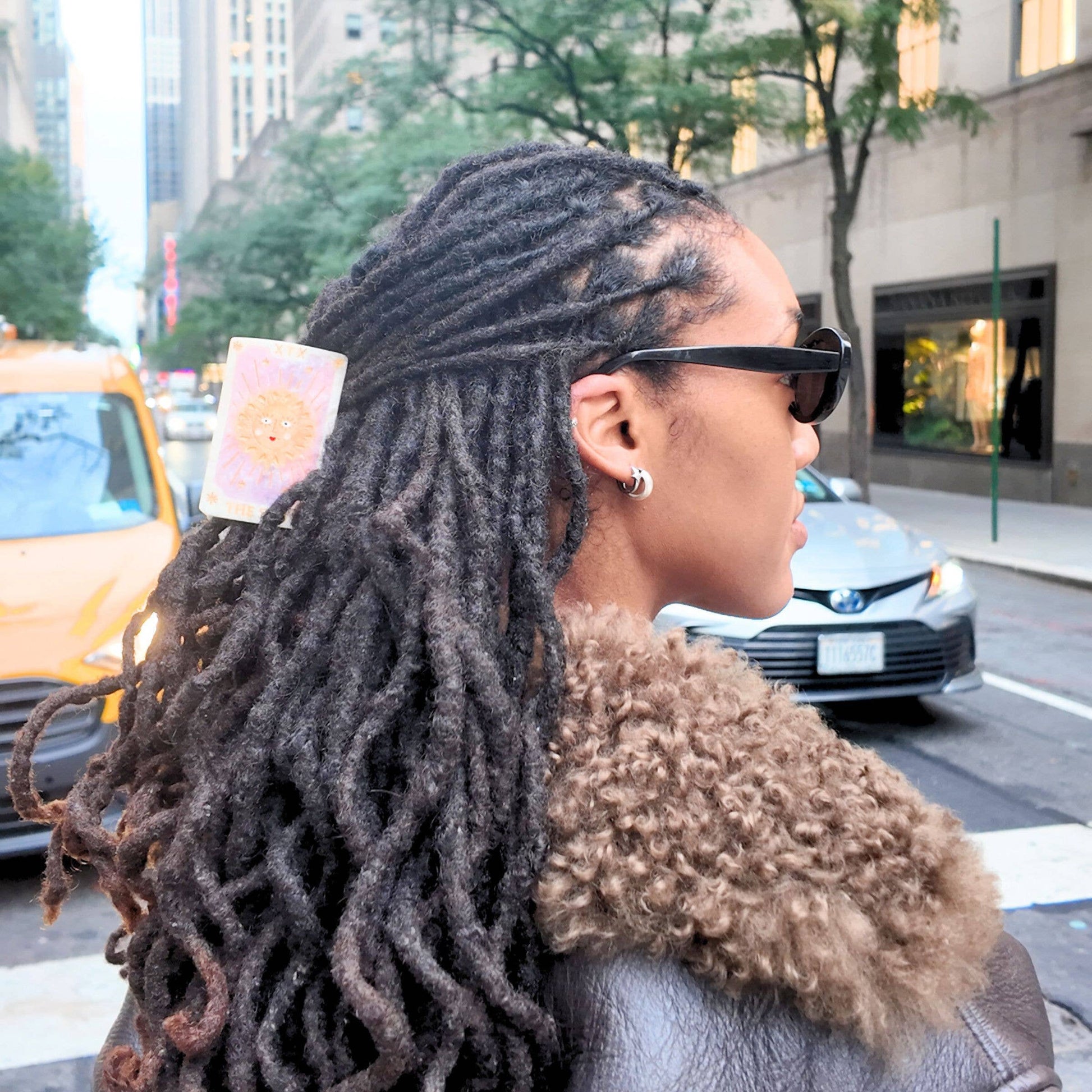 Each clip is unique, thanks to the hand-painted golden sun, complete with a cheeky face and pink tarot card backdrop. No two are exactly the same, which is kind of the point. Designed in New York City, made to be treasured for years, and finished off in sustainable, recyclable packaging.