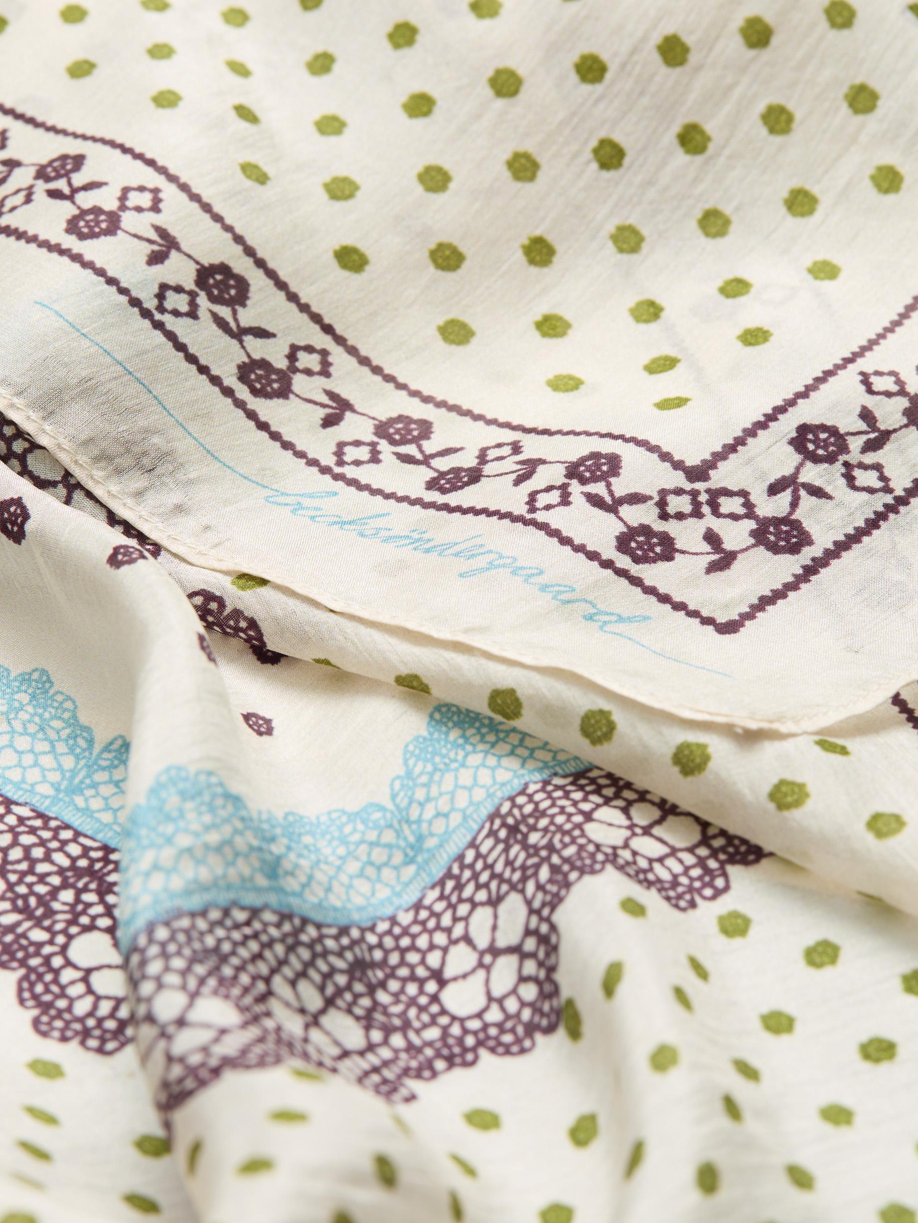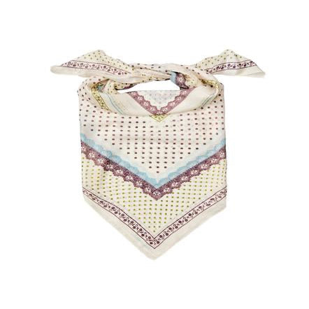 The Becksöndergaard Lacia Tabby Sia Scarf in Birch White is a classic square with a twist. Made from smooth, lightweight silk, it has a soft drape and a gentle sheen that catches the light just right. The cream base is framed by layered borders of dots and geometric trims in muted tones of lilac, sage, and soft blue — a fresh update on Becksöndergaard’s signature bandana print. It’s refined, but still has that easy, throw-it-on energy that makes it so wearable.