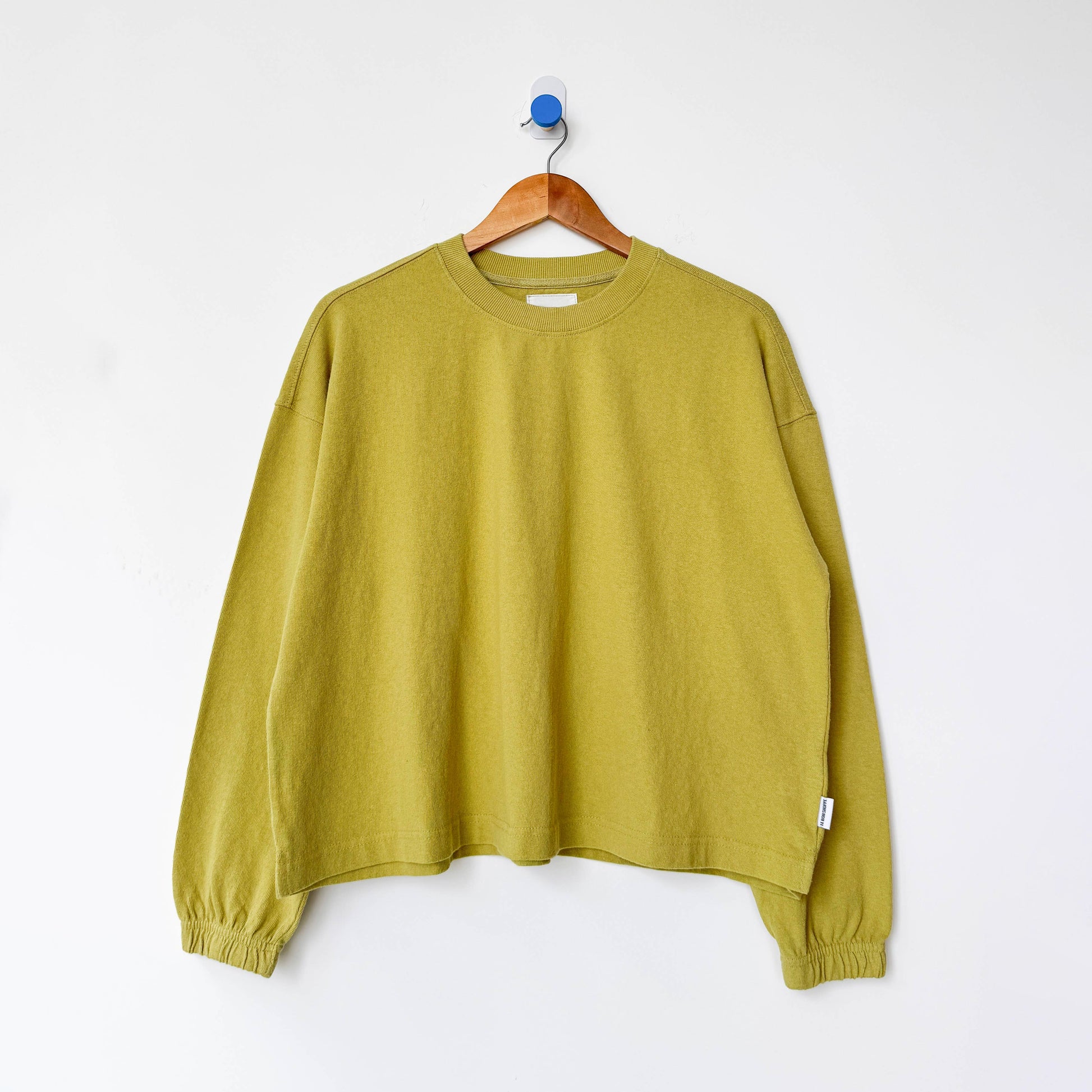 Le Bon Shoppe’s Naturelle Tee in ochre is one of those pieces that looks deceptively simple until you put it on — and then suddenly it becomes the thing you want in every colour. It’s a classic long-sleeve crew, but with all the quiet design details that make it feel considered rather than basic. The fit is gently boxy, landing right at the hip so it works just as well loose as it does with a casual tuck. The dropped shoulders and relaxed cut give it that effortless, slightly slouchy shape that always looks good.