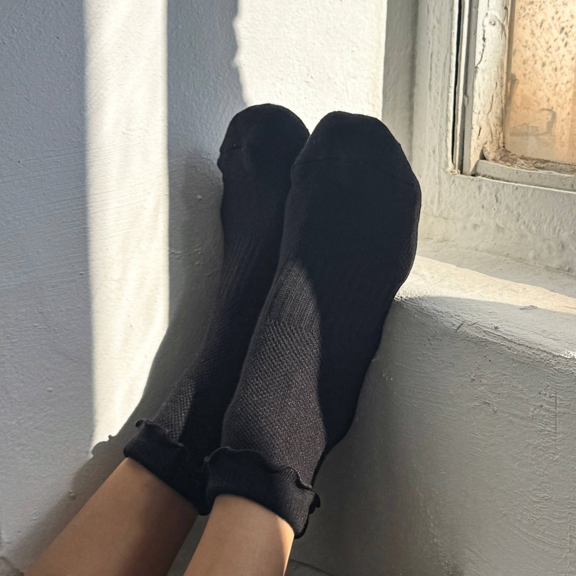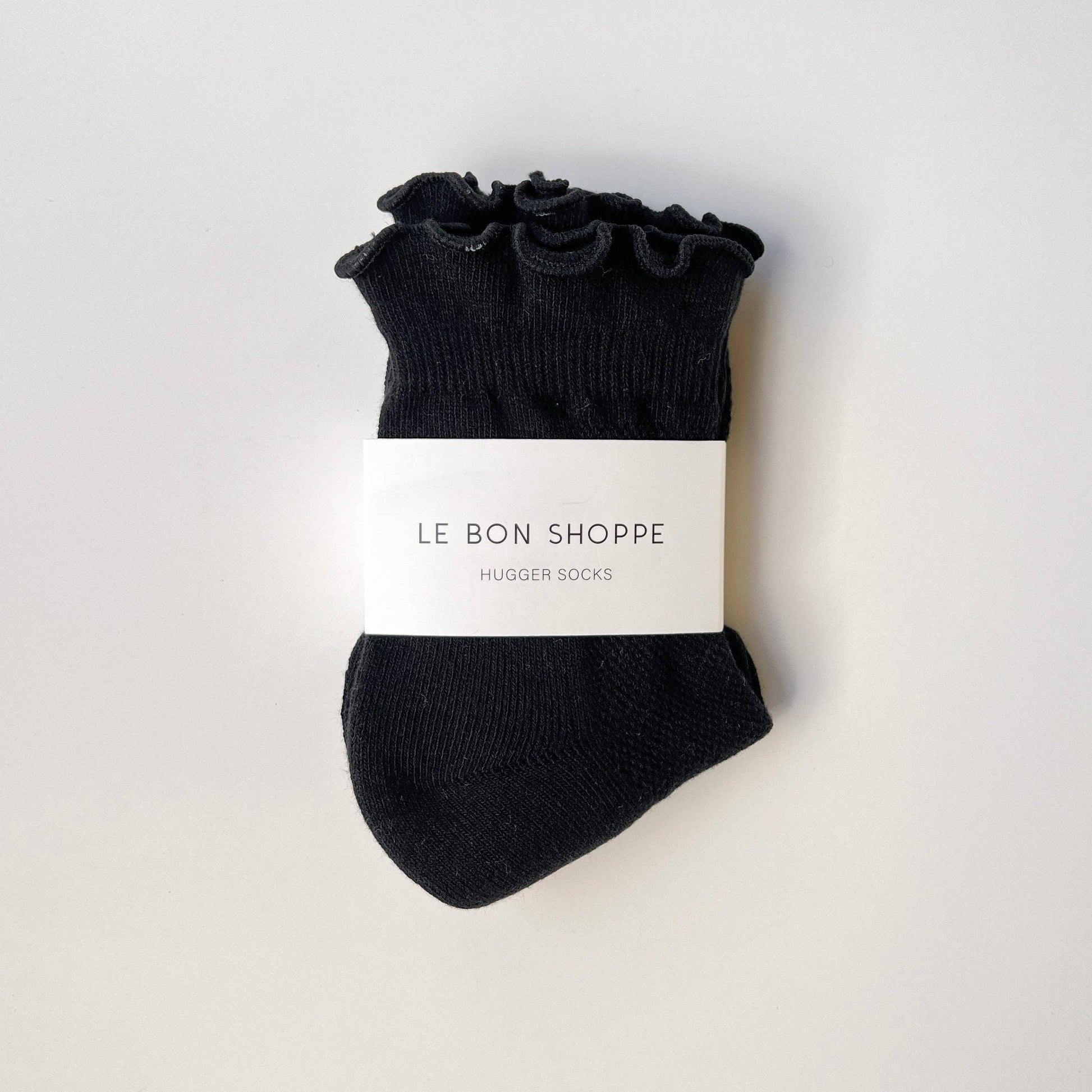 The Le Bon Shoppe Ruffled Hugger Crew Socks in black keep things sharp, grounded, and quietly confident. Same much-loved Hugger base, same soft ruffled edge — just rendered in an inky black that goes with absolutely everything and doesn’t ask for attention.