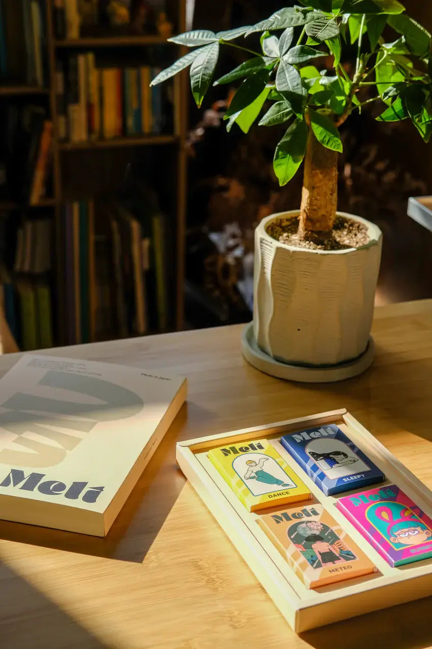 The presentation is part of the appeal. Each inner box carries its own colour and illustrated figure, giving the set a playful visual rhythm, while the outer packaging remains clean and minimal. It feels thoughtful without being elaborate — the sort of object that sits neatly on a shelf when not in use.