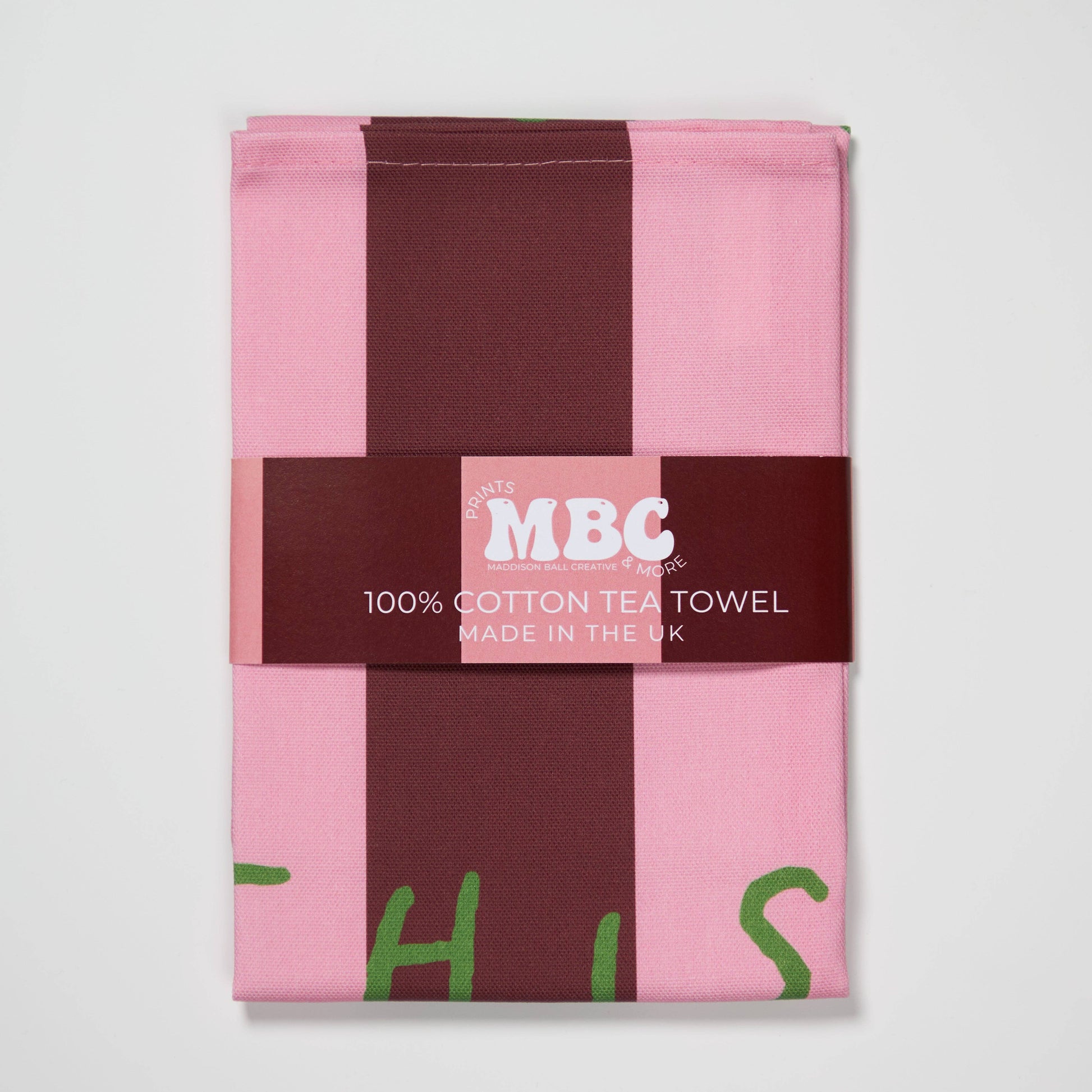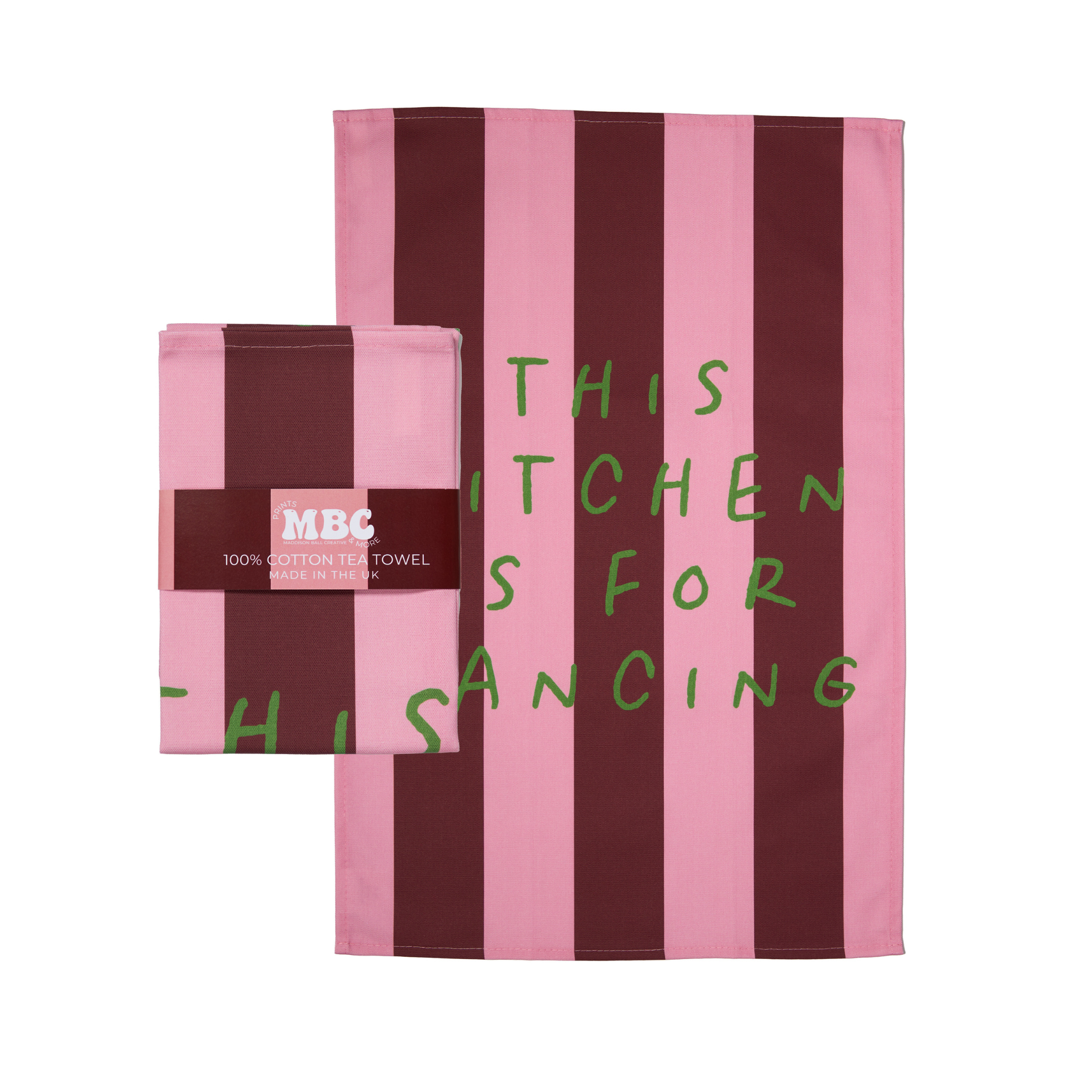 Made in the UK from 100% cotton, the bold striped print in deep burgundy and pink brings a punch of colour, while the playful green hand-lettering keeps it cheeky. It’s durable enough to dry your dishes day in, day out, but stylish enough to hang proudly on display.