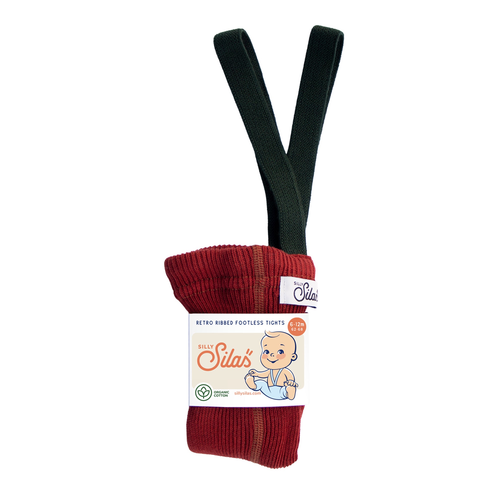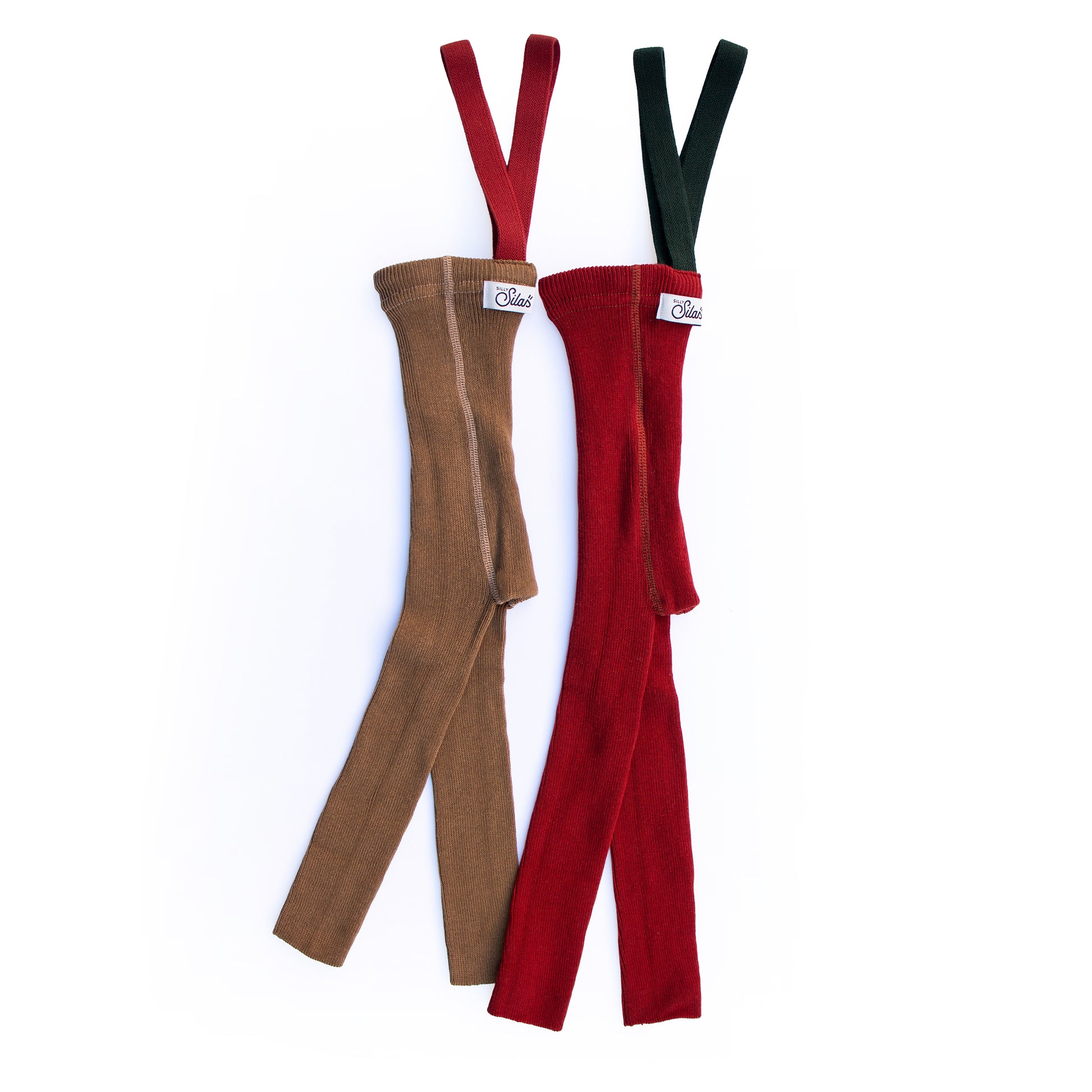Silly Silas Maple Leaf with Dark Forest Green Footless Tights — the ones you’ll reach for on repeat. A warm autumnal pairing of earthy acorn-brown legs and deep forest green braces, they strike that perfect balance between playful retro charm and everyday practicality.