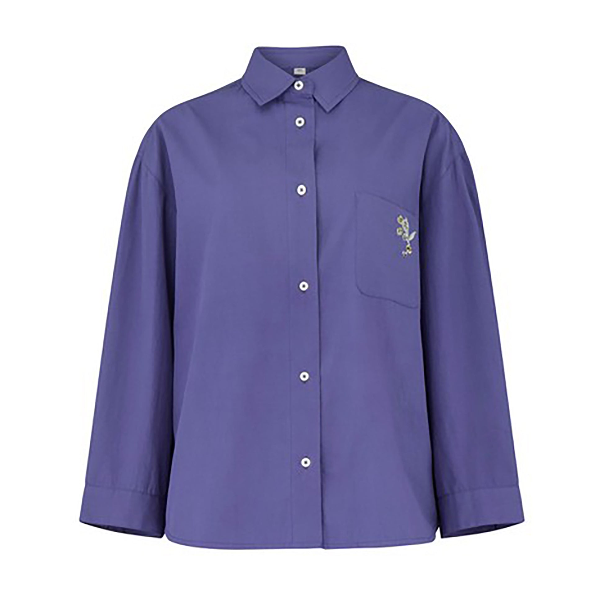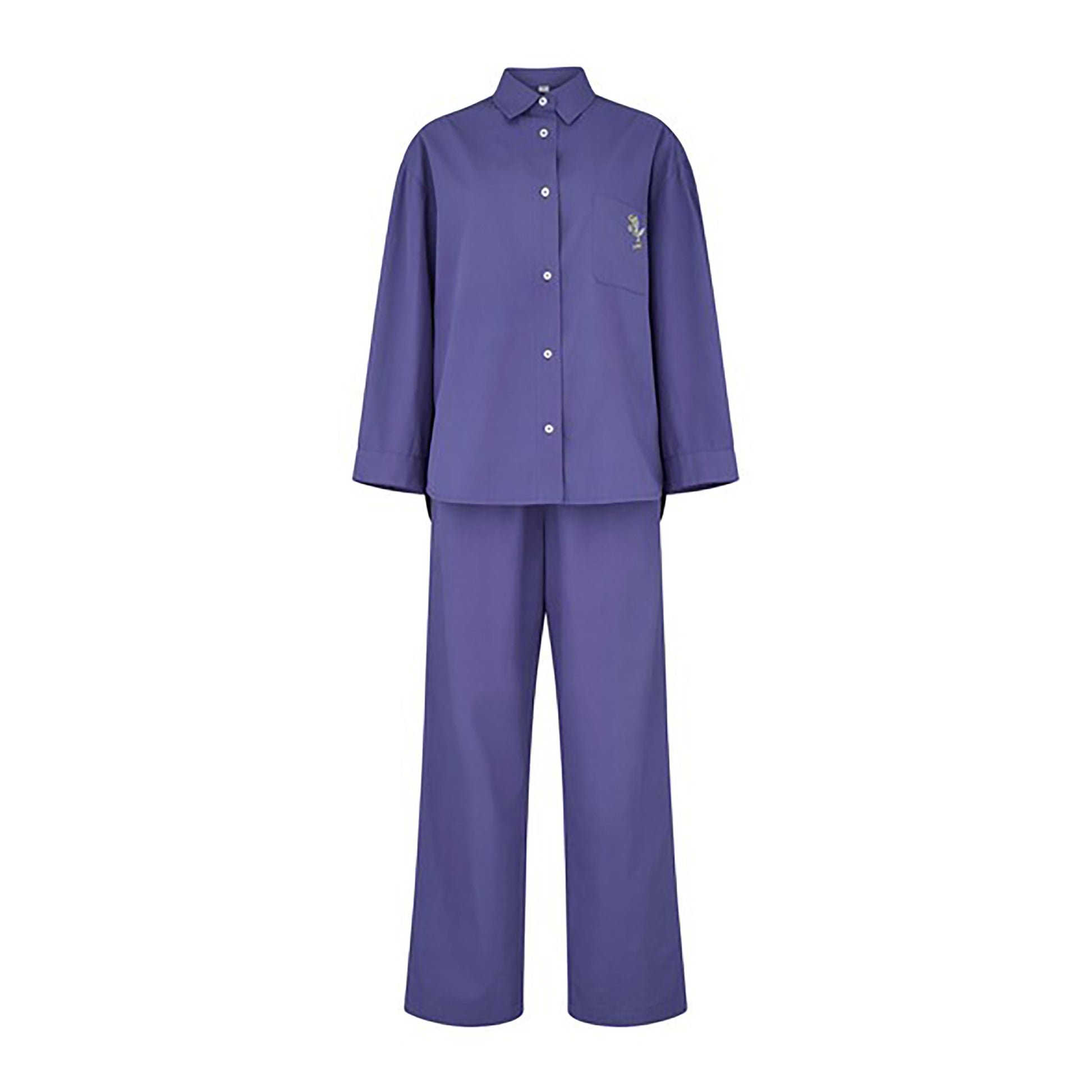 The Becksöndergaard Aura Pyjamas Set in Purple Dusk makes staying in look a lot more intentional. Made from soft, breathable cotton, the set has an easy, relaxed fit that still feels pulled together. The button-up shirt has a boxy cut with a small embroidered floral detail on the pocket, while the matching trousers feature a comfortable drawstring waist and a wide-leg shape that drapes nicely without clinging.