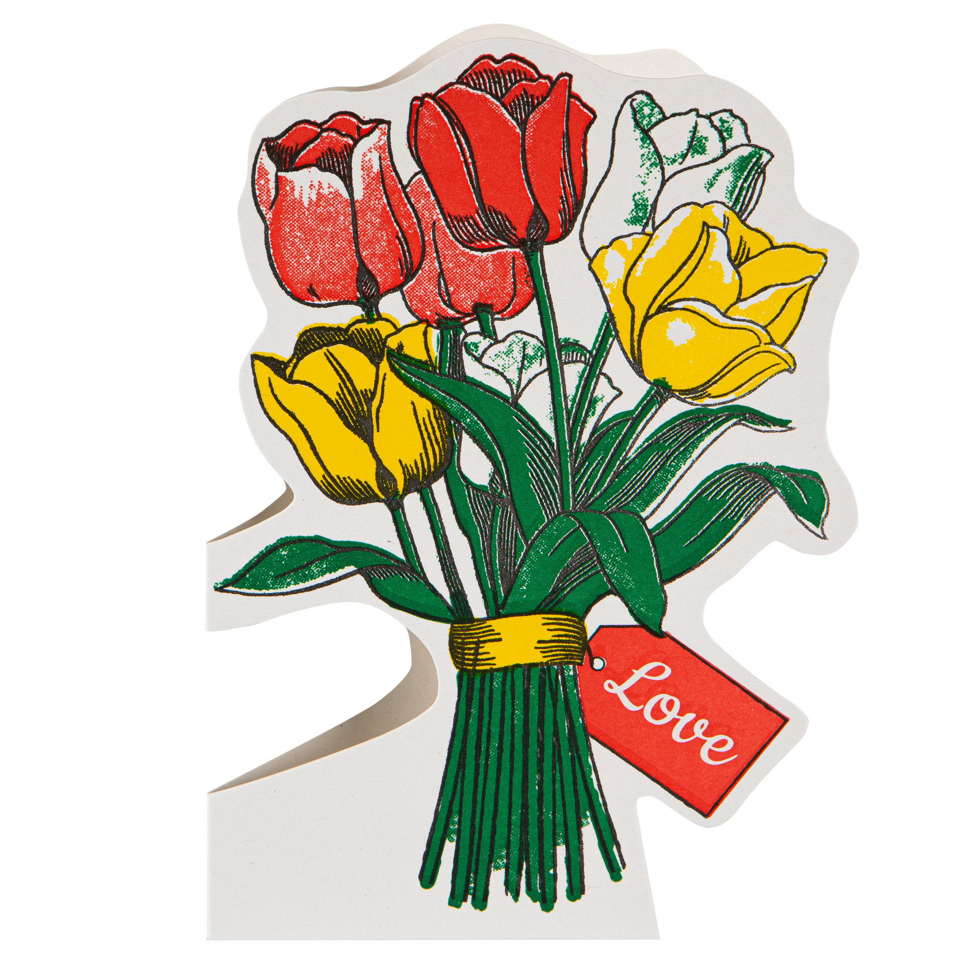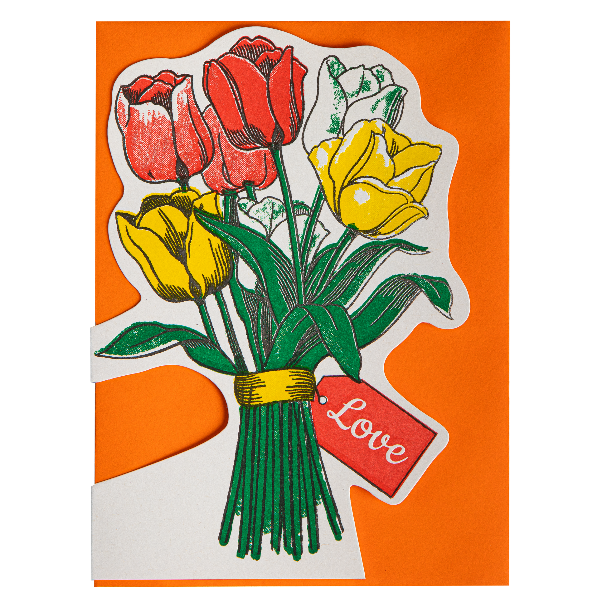 Not your average card. This letterpress cut-out tulip bouquet is bold, graphic and designed to be kept, not quietly binned a week later. The illustration shows a bunch of brightly coloured tulips tied together with a simple tag reading ‘love’ — no overthinking, no extra words needed.