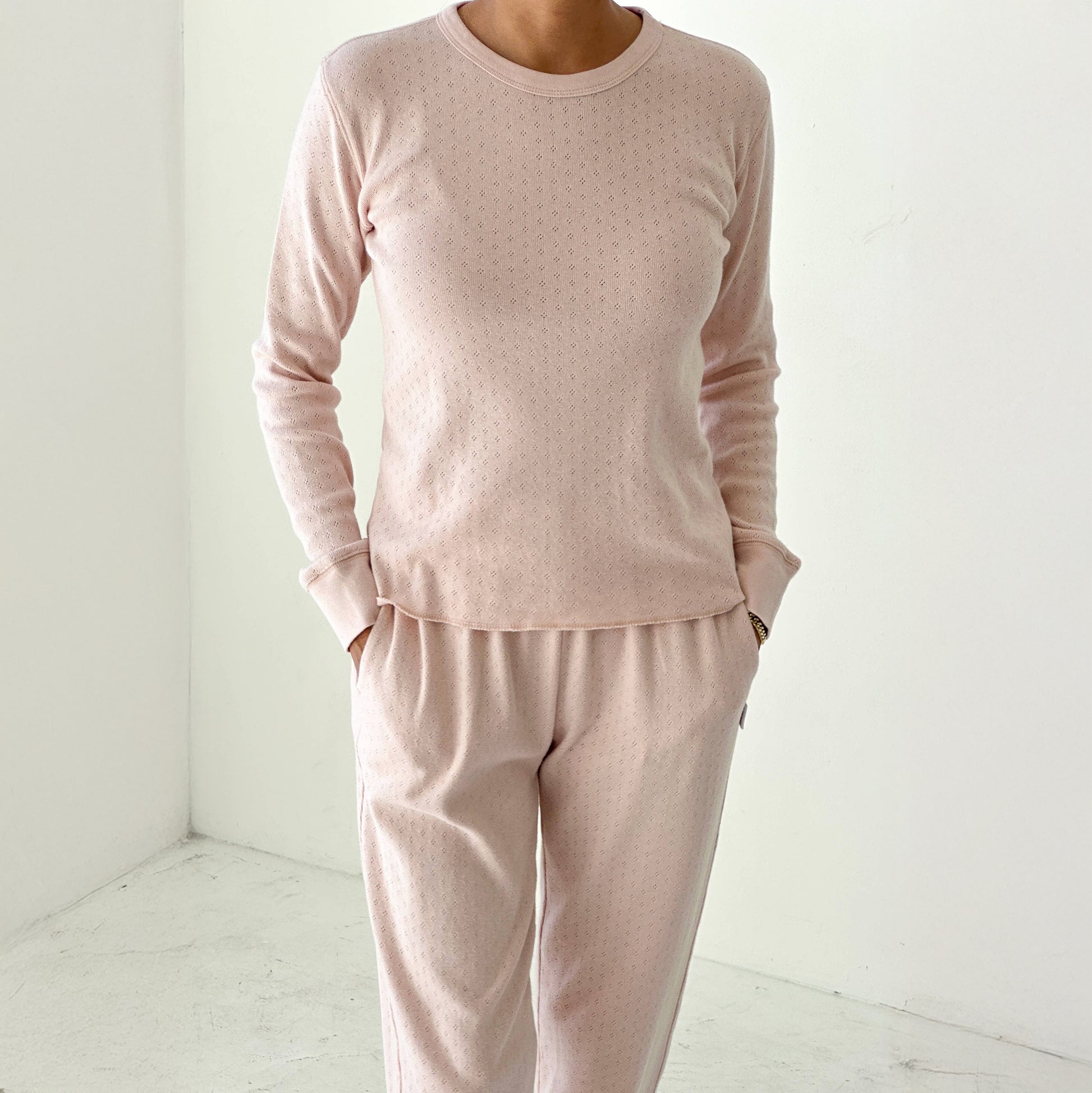 This is the kind of tee that quietly does everything right. Le Bon Shoppe’s Pointelle Fundamental Tee is one of those pieces you put on “just for layering” and then suddenly you’re wearing it three days a week because it feels that good. Made in a soft baby-pink pointelle with that subtle, nostalgic texture, it sits close to the body without feeling clingy, and has enough stretch to keep things comfortable from school run to sofa.