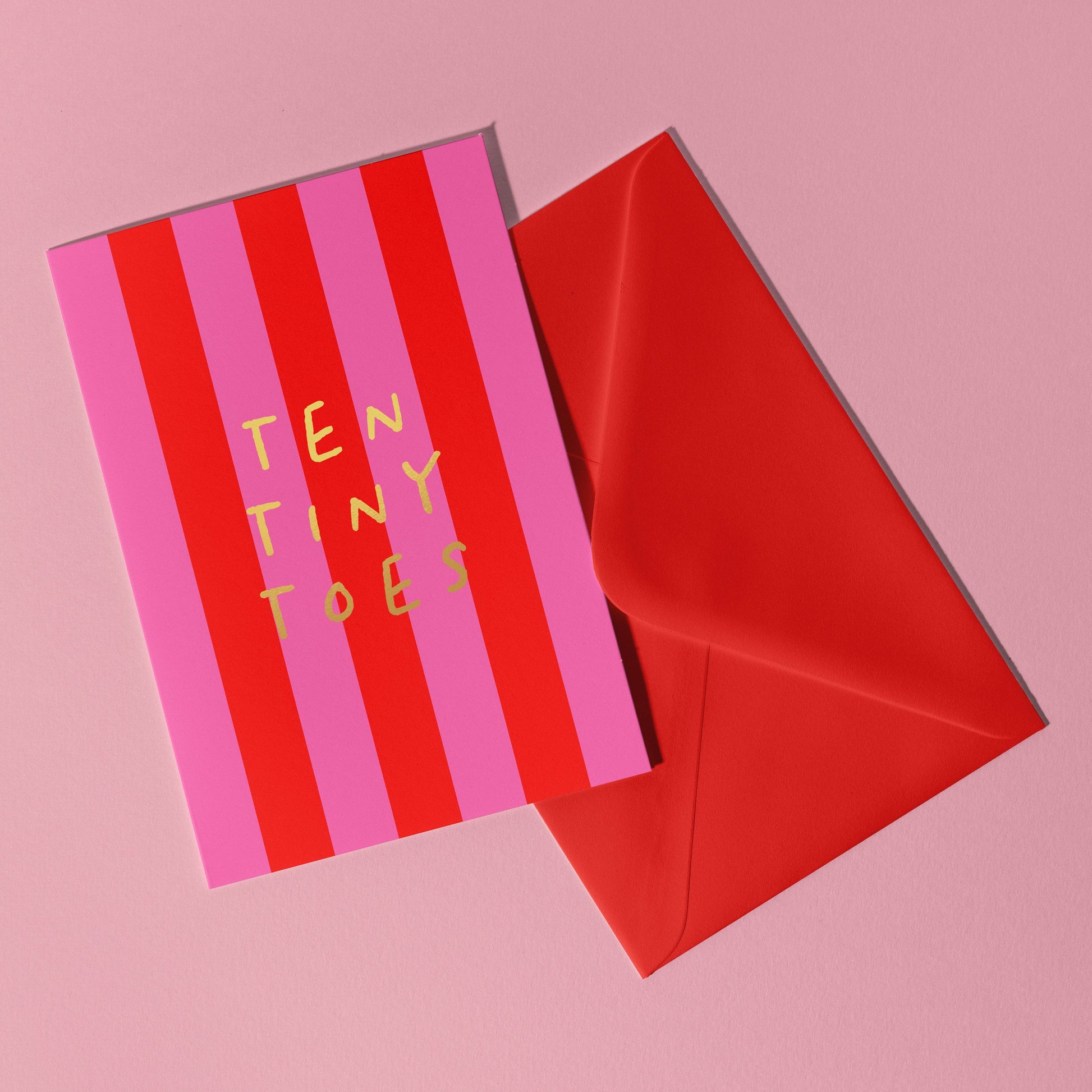 Bold stripes, bright colours, and a touch of gold—this Ten Tiny Toes card is made for celebrating new arrivals in style. Forget the predictable pastels; this one comes in punchy pink and red with metallic lettering that feels fresh and joyful.