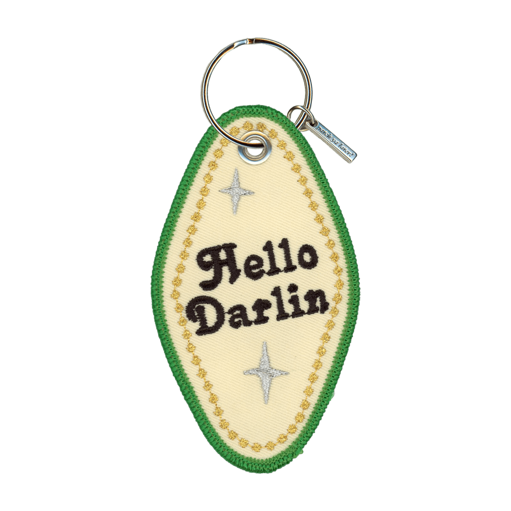 This embroidered motel-style keychain leans fully into that roadside charm: cream centre, green stitched border, tiny silver starbursts and a tomato on the flip side that looks like it knows exactly what it’s doing. It’s playful, a little flirty, and just the right amount of kitsch without tipping into parody.